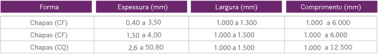 Nota: CF – Chapa Laminada a Frio | CQ – Chapa Laminada a Quante – Tolerâncias Dimensionais conforme Norma ASTM A480 / A480M